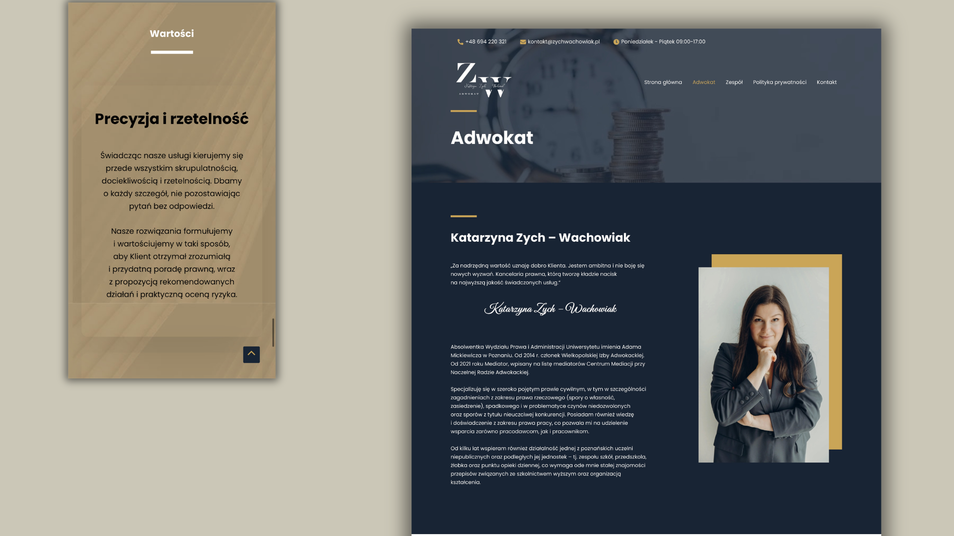 Strona Adwokat Katarzyny Zych-Wachowiak została zaprojektowana jako przestrzeń, w której litera prawa spotyka się z ludzkim podejściem i skutecznością. Inspiracją do stworzenia projektu była sama filozofia kancelarii – świadczenie pomocy prawnej w sposób rzetelny, z zachowaniem najwyższych standardów etyki oraz pełnym zaangażowaniem w sprawy klientów. Klasyczna, profesjonalna kolorystyka, przejrzysta struktura oraz czytelna typografia nadają witrynie eksperckiego i godnego zaufania charakteru, zachowując przy tym pełną klarowność przekazu.