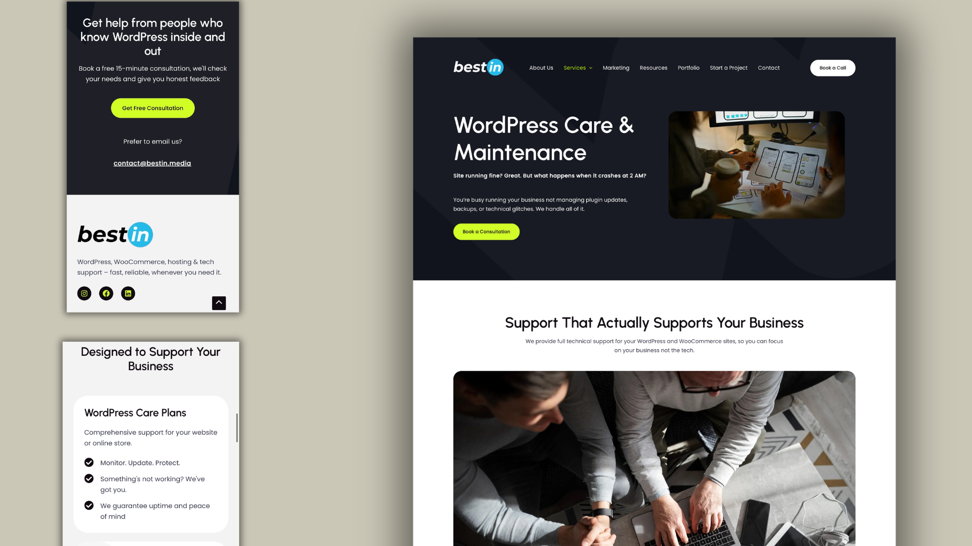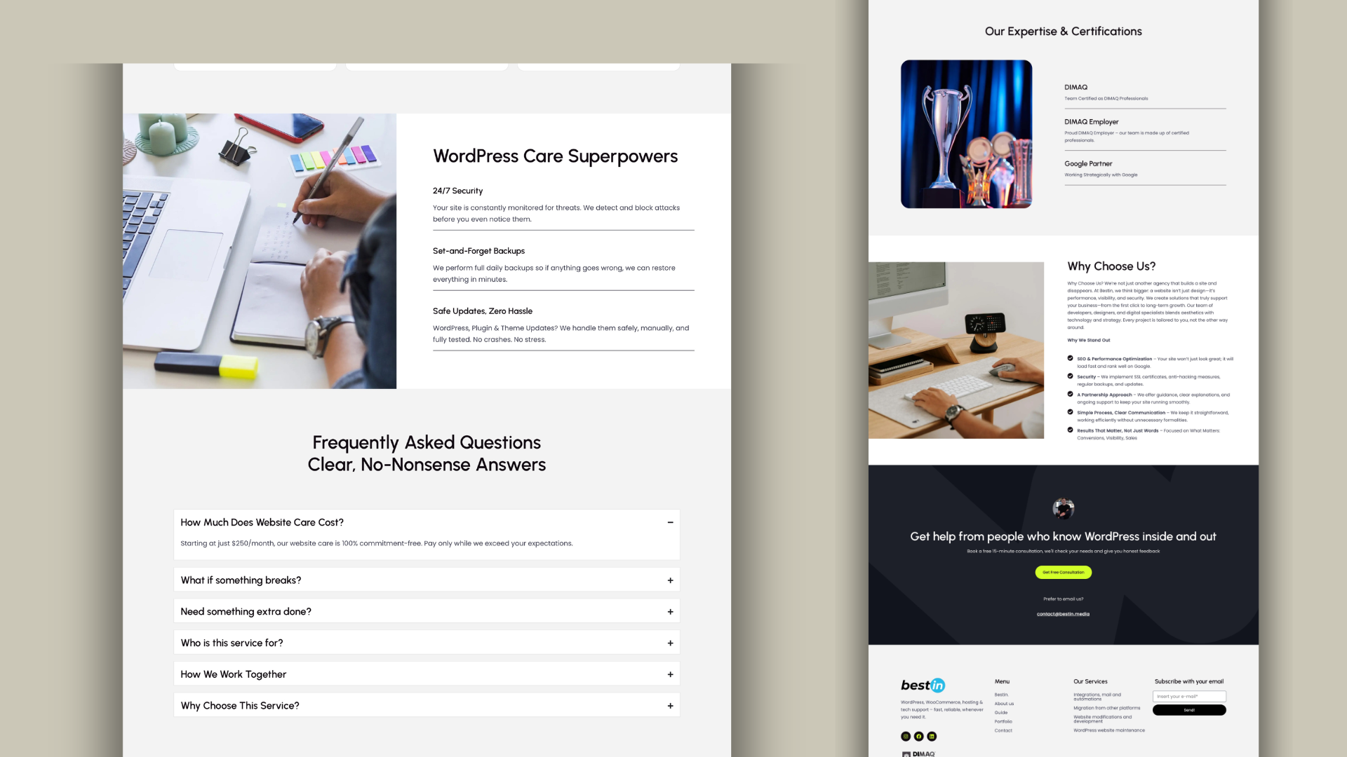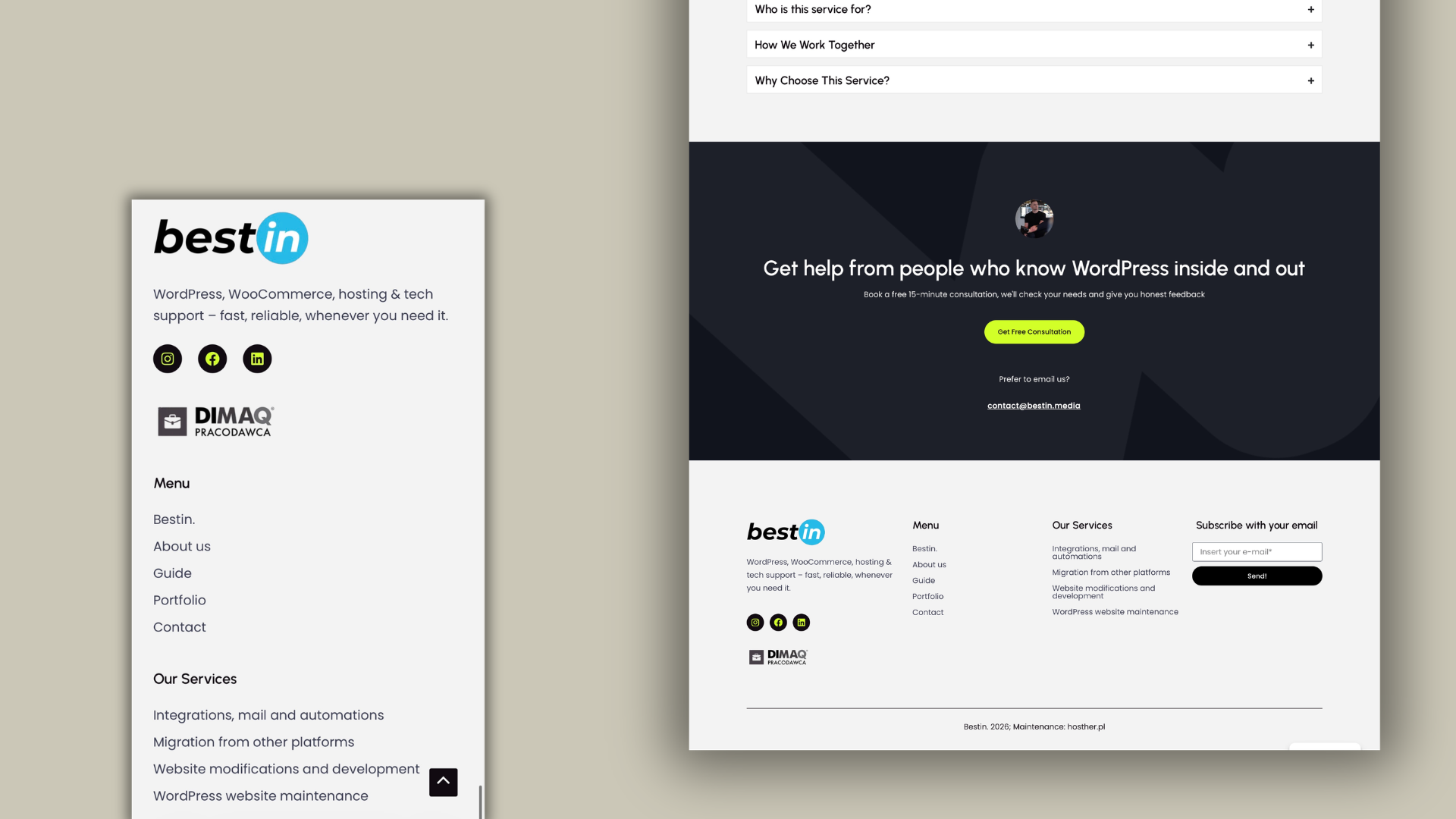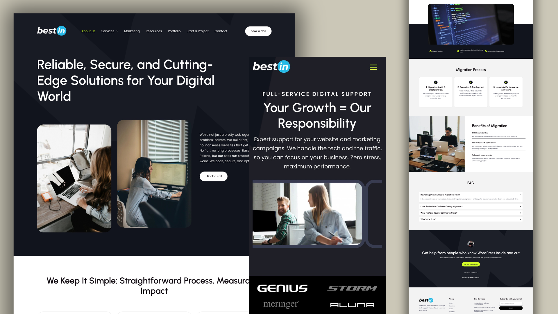 Dzięki tym elementom witryna nie tylko w pełni prezentuje potencjał zespołu, ale również buduje wizerunek Bestin. jako ekspertów, którzy potrafią przełożyć skomplikowane rozwiązania IT na realny sukces i bezpieczeństwo swoich klientów.