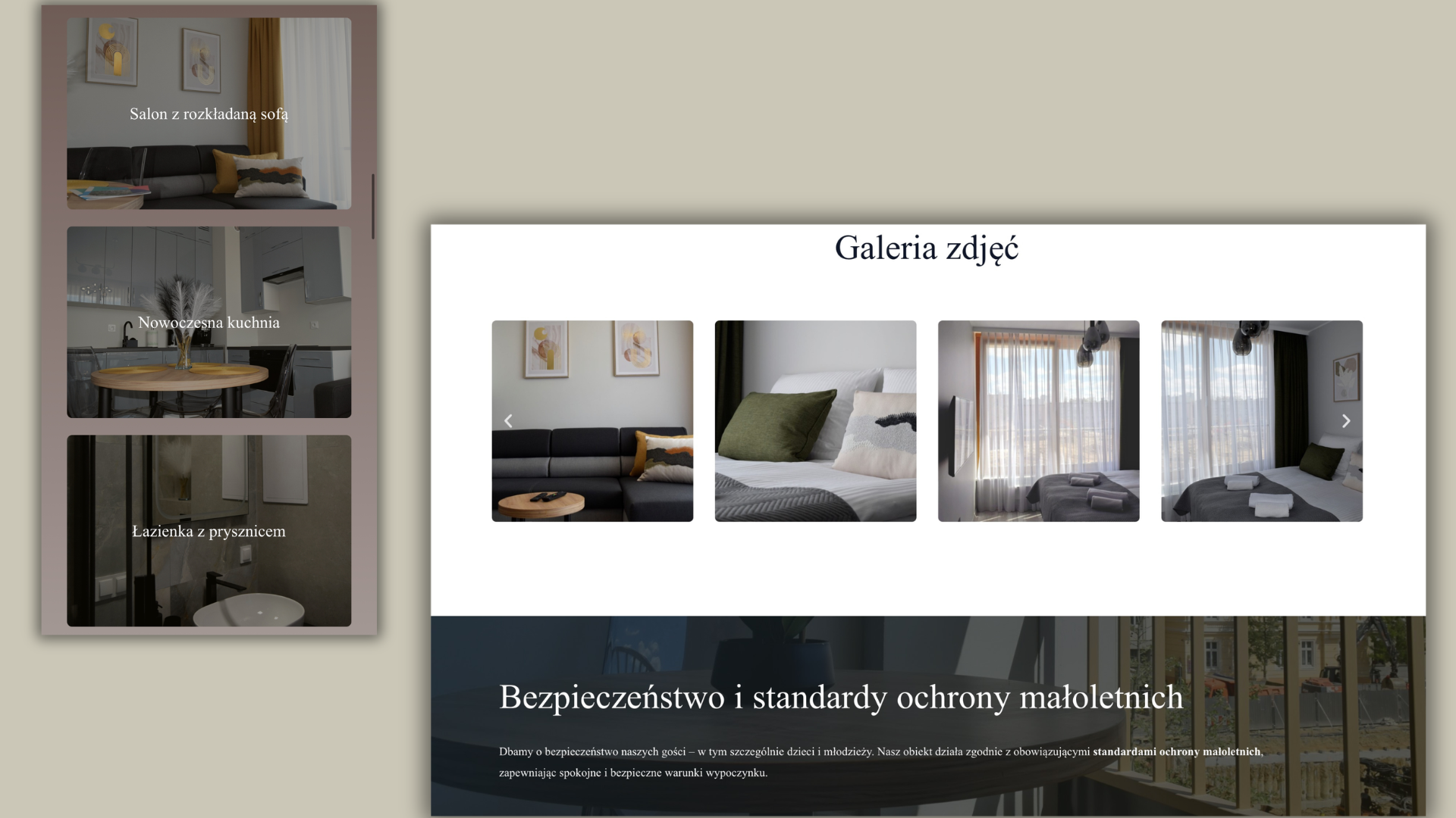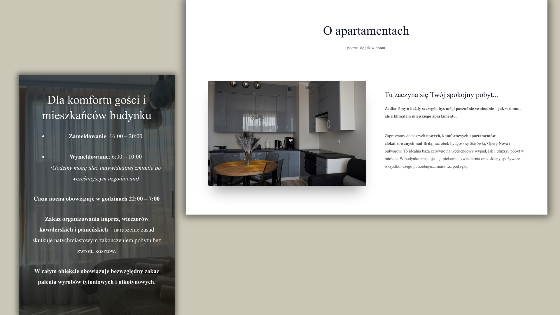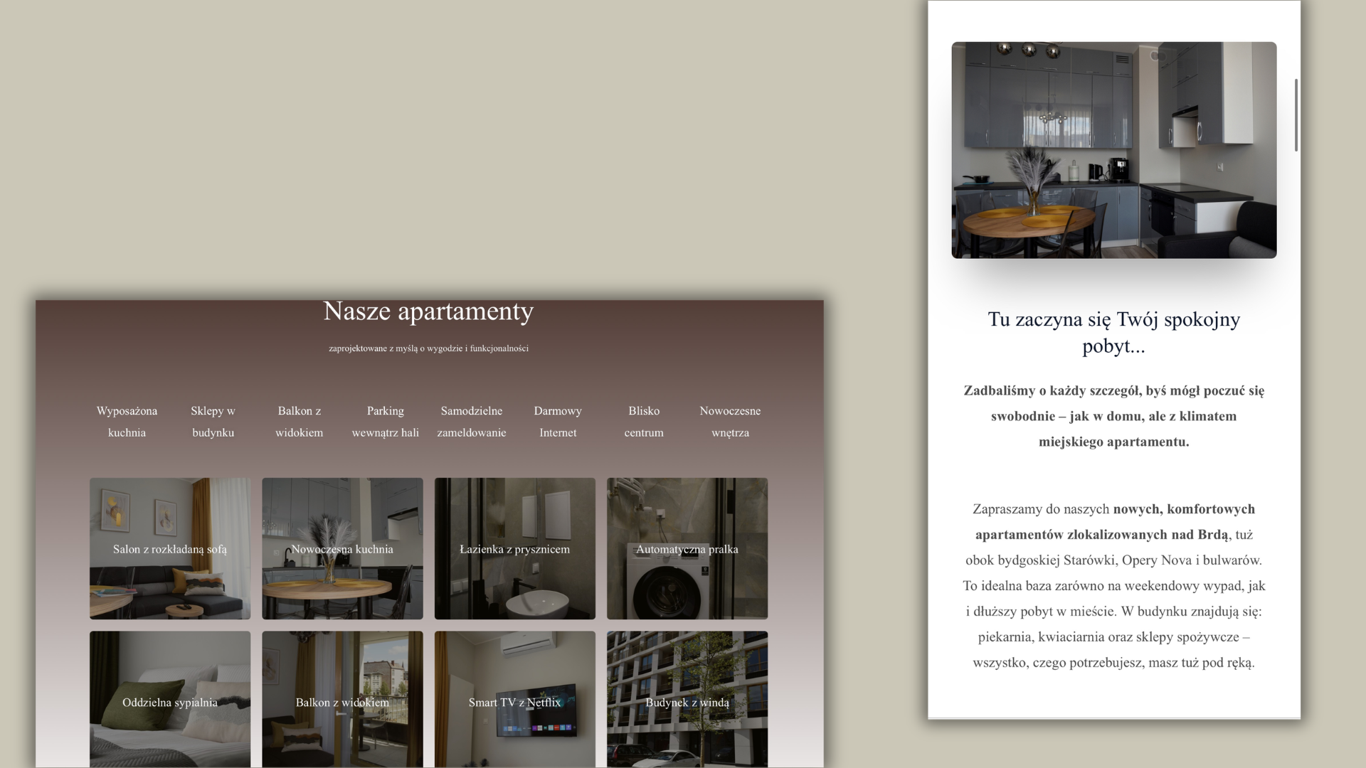 Strona Domków letniskowych Nad Portem została zaprojektowana jako przestrzeń, w której nowoczesny komfort spotyka się z klimatem miejskiego wypoczynku. Inspiracją do stworzenia projektu była chęć zaoferowania gościom standardu premium – miejsca, które łączy domową przytulność z elegancją luksusowego apartamentu. Przejrzysty układ, harmonijna kolorystyka oraz wysublimowana warstwa wizualna podkreślają dbałość o detale i wysoki standard wykończenia wnętrz, zachęcając do odpoczynku w sercu miasta.
