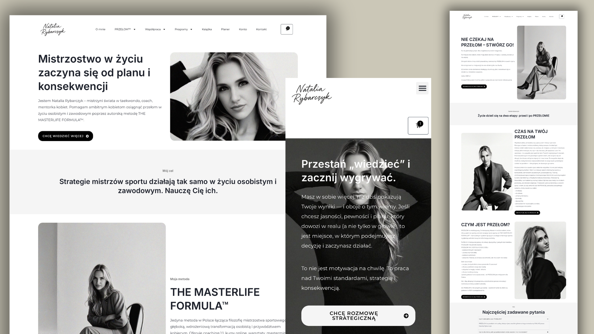 Strona Natalii Rybarczyk została zaprojektowana jako przestrzeń, w której mentalność mistrza sportu spotyka się z konkretną strategią rozwoju osobistego i biznesowego. Inspiracją do stworzenia projektu była sama droga zawodowa autorki – mistrzyni świata w taekwondo, która zasady dyscypliny, walki i zwycięstwa przekuła w autorską metodę THE MASTERLIFE FORMULA™. Dynamiczny, a zarazem niezwykle przejrzysty design, zdecydowana typografia i profesjonalna oprawa wizualna nadają witrynie charakteru premium, budując wizerunek miejsca dla osób ambitnych, gotowych na realny przełom.