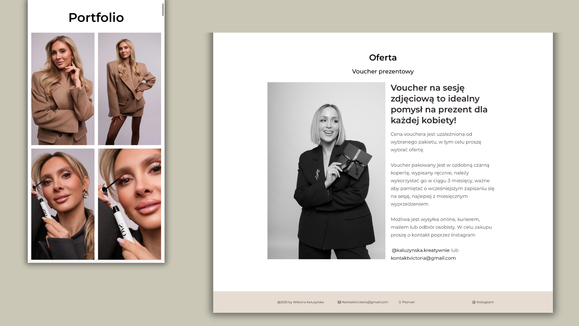 Dzięki tym elementom witryna nie tylko stanowi doskonałą wizytówkę artystyczną, ale również wzmacnia wizerunek Victorii Kałużyńskiej jako ekspertki, która pomaga kobietom opowiedzieć ich historię poprzez obraz, łącząc pasję do mody z biznesową skutecznością.